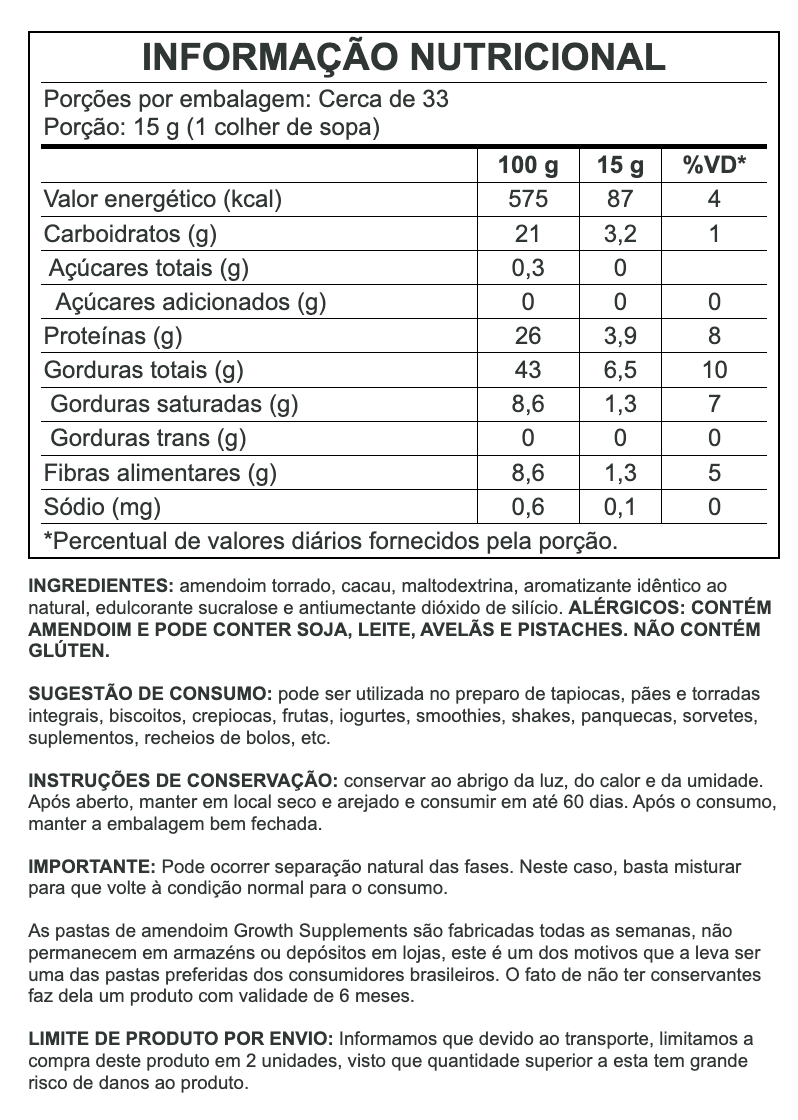 Growth Supplements' 500g Brigadeiro-Flavored Peanut Butter combines the irresistible flavor of brigadeiro with the nutritional qualities of peanut butter. Rich in protein and healthy fats, it's ideal for those seeking energy and muscle support in a practical and tasty diet. Perfect for supplementing the diets of athletes and fitness enthusiasts, it offers a functional option that combines pleasure and performance.